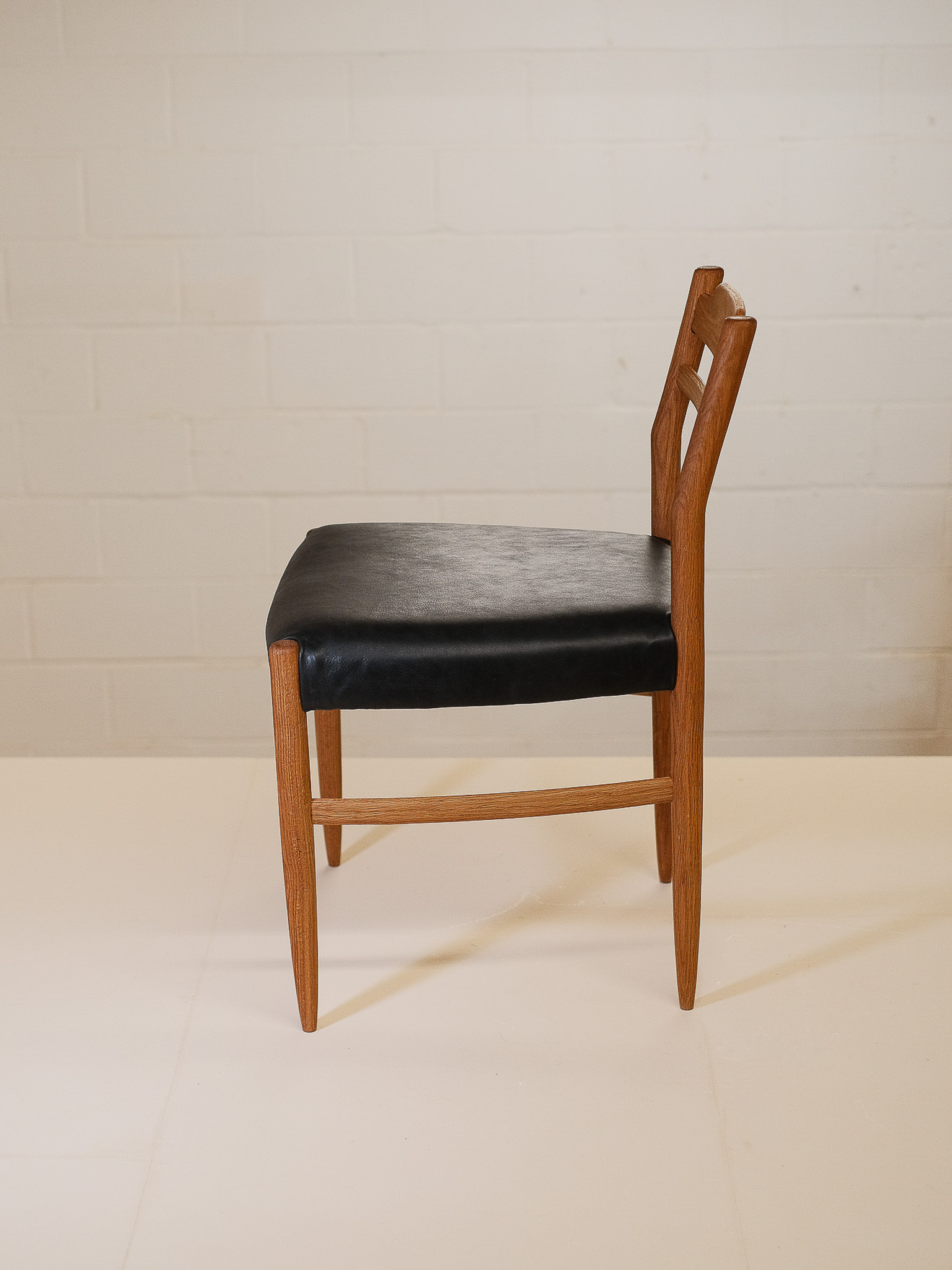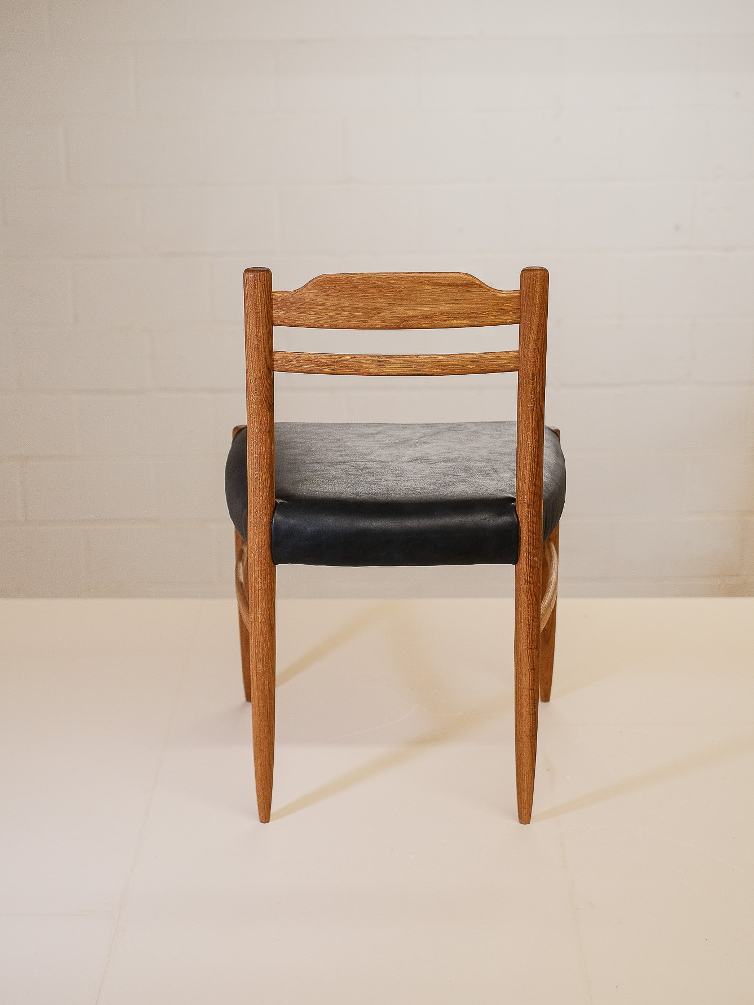 Shown here in a Black American walnut frame, it is also available in solid oak for a lighter, natural look. The seat is upholstered in leather, offered in warm natural brown or classic black, allowing you to tailor the chair to your interior style.