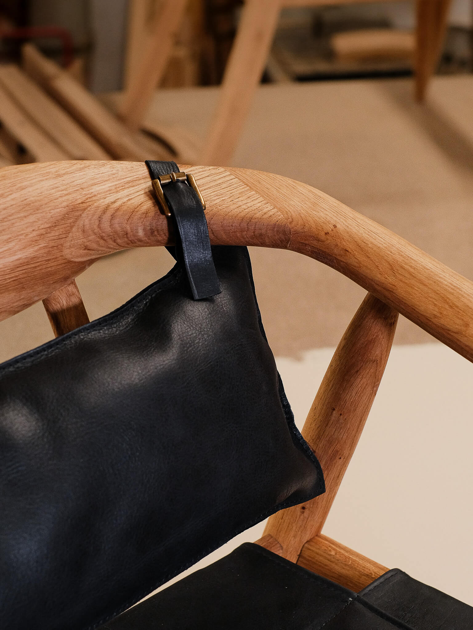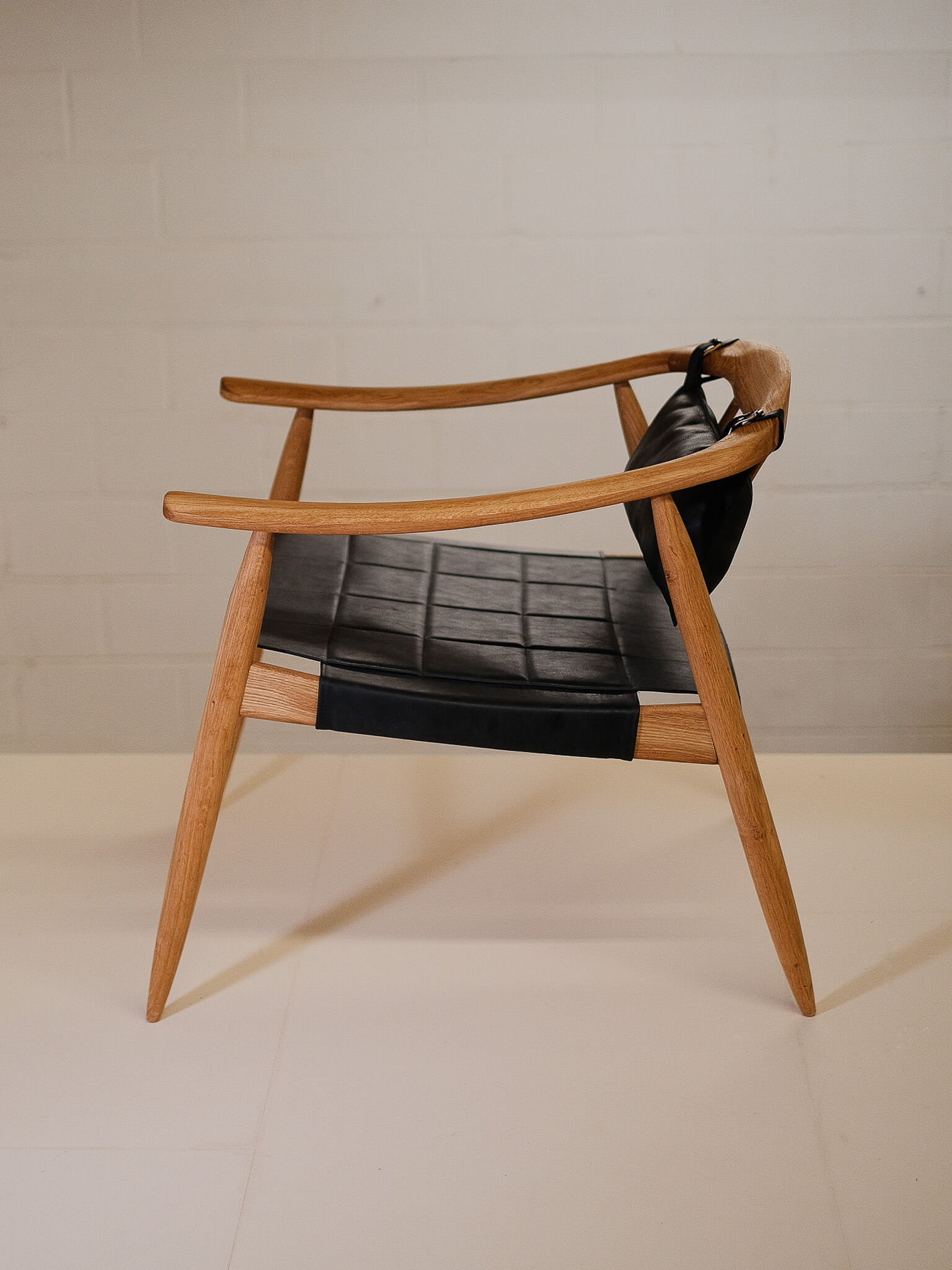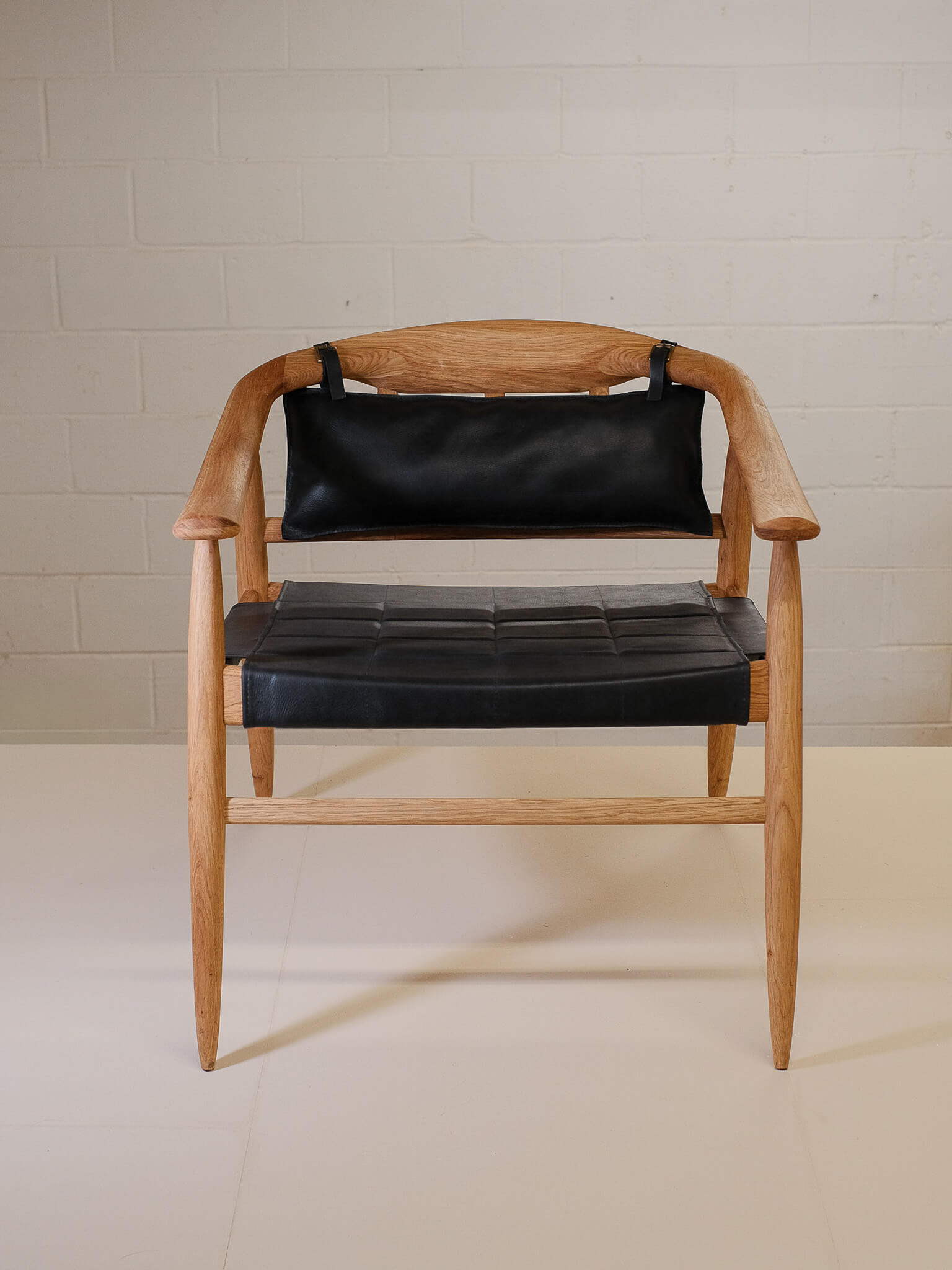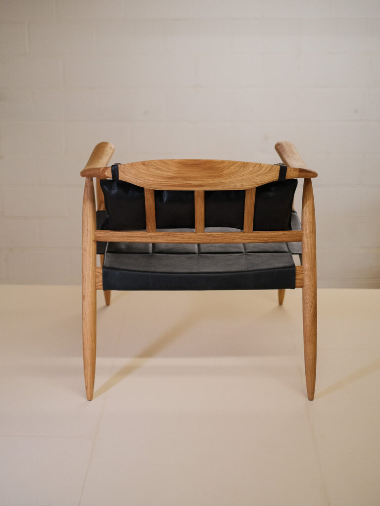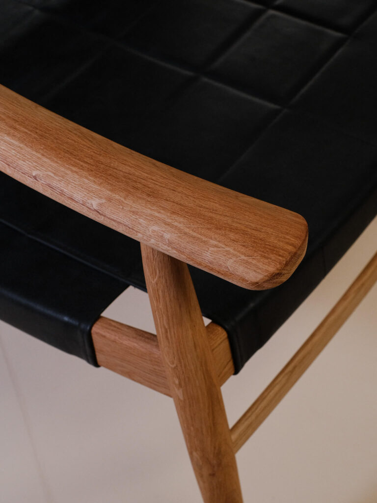 Crafted with a solid oak frame, this chair offers both durability and sophistication. The seat and back cushion are upholstered in hand-sewn leather, available in rich black or warm natural brown, creating a striking contrast against the wood’s natural finish.